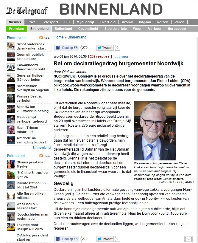 Waarnemend burgemeester van Noordwijk, Jan Pieter Lokker, haalde vandaag twee landelijke dagbladen met twee verschillende items. In de Telegraaf werd hij voorpaginaal aangeklaagd vanwege gedoe met bonnetjes over woon-werkverkeer. En in de Volkskrant verscheen hij met een interview en bijpassende photo over zijn nieuwjaarstoespraak.