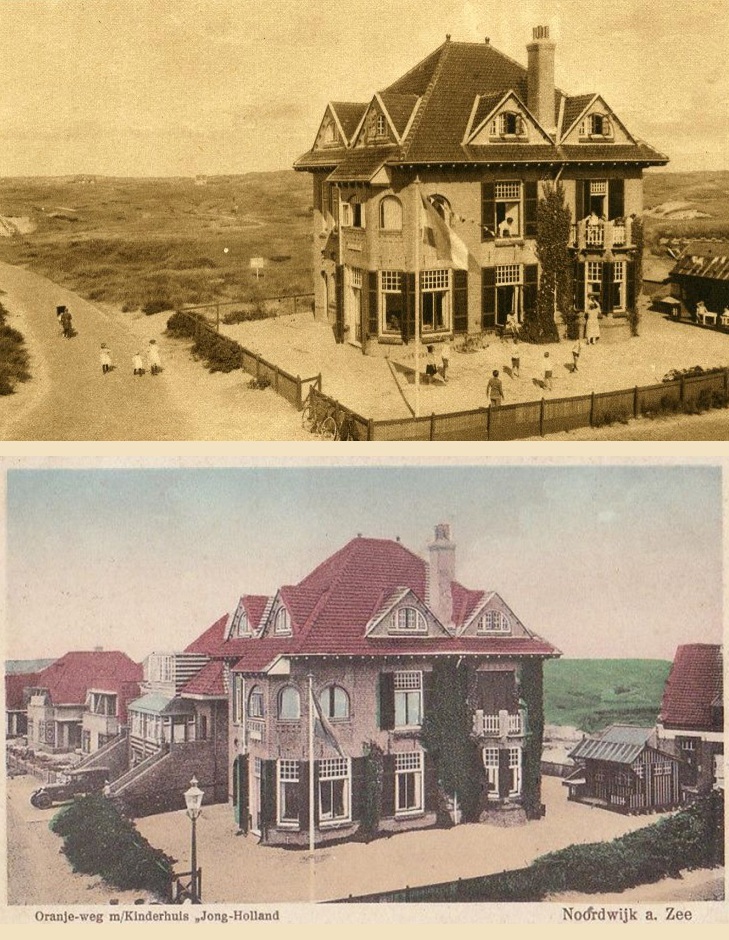 Kinderhuis “Jong Holland” hebben we wel eens eerder aan de hand gehad, zij het dat ik er niet zo veel verhaal bij wist te vertellen. De reden daarvan is dat er op internet maar weinig documentatie over te vinden is. Ik weet dat het dateert van rond 1920 en dat het werd gerund door de dames Alsbach en Oolgaardt. Dat het gestaan moet hebben op de hoek van Parallelboulevard/Jan van Henegouwenweg, aanvankelijk vrijwel helemaal vrijstaand in een nog maagdelijk duingebied. Daar kwam al snel enige verandering in, toen de eerste huizen werden gebouwd aan de latere Oranjeweg (zie onderste foto), maar inmiddels is het hele gebouw naar de gallemiezen en vervangen door een zielloos gebouw, dat ‘Strandhotel’ heet (maar niet eens aan het strand staat!).