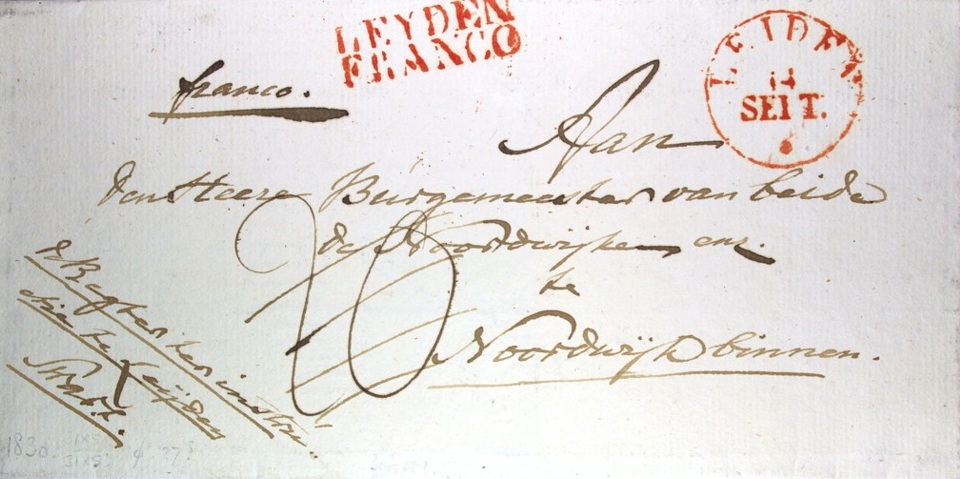 Hoe die prachtige stempels heetten, weet ik niet, dat moet ik nog eens uitzoeken. Maar het moeten zo ongeveer de eersten in hun soort zijn geweest, want we spreken over 14 september 1830 als datum waarop deze envelop op de post ging. Gericht aan “den Heere Burgemeester van de beide Noordwijken te Noordwijk Binnen”. De afzender is wat onleesbaarderderderder.