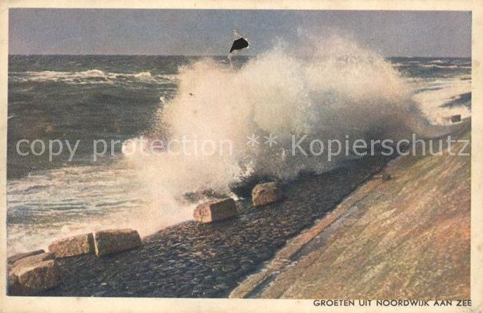 “Copy protection”en “Kopierschutz” heeft iemand over deze foto heen gestempeld. Maar waarom zou iemand het in zijn hoofd halen dit te kopiëren? Het is een uitermate valselijk beeld wat hier getoond wordt: een kuststrook met betonnen dijkverzwaring en basaltblokken als weermiddel tegen de wateren. En er dan nog ”Groeten uit Noordwijk aan Zee” onder durven zetten. Dit is prullenbakkenwerk. In Noordwijk ligt wel een dijk, maar die ligt niet aan de waterlijn en is verstopt onder hoge bergen zand (zo hoog, dat je de zee niet eens meer kan zien 🙂 ).