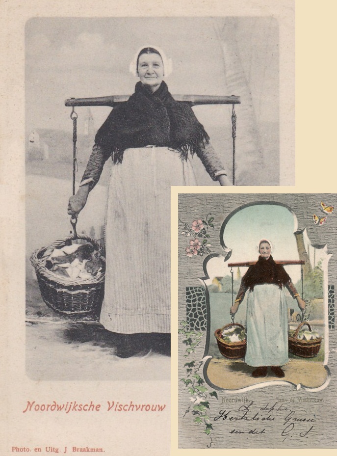 Een hele tijd geleden had ik de grote foto al te pakken, maar die was nog anoniem. Nu kom ik de ingekleurde versie tegen met de naam en toenaam van de afgebeelde dame: “Jaan de Vischvrouw”. Fotograaf Braakman was blijkbaar ontevreden over zijn eerste afdruk en knutselde er van alles aan kleur en versiering bij.
