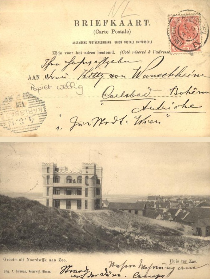 De kaart ging op 2 augustus 1903 vanuit Noordwijk naar Carlsbad aan ene Kitty von Wunschheim. Deze Kitty valt nergens meer op internet te vinden. Maar Carlsbad is bekender, zij het dat de stad in deze benaming niet meer bestaat.