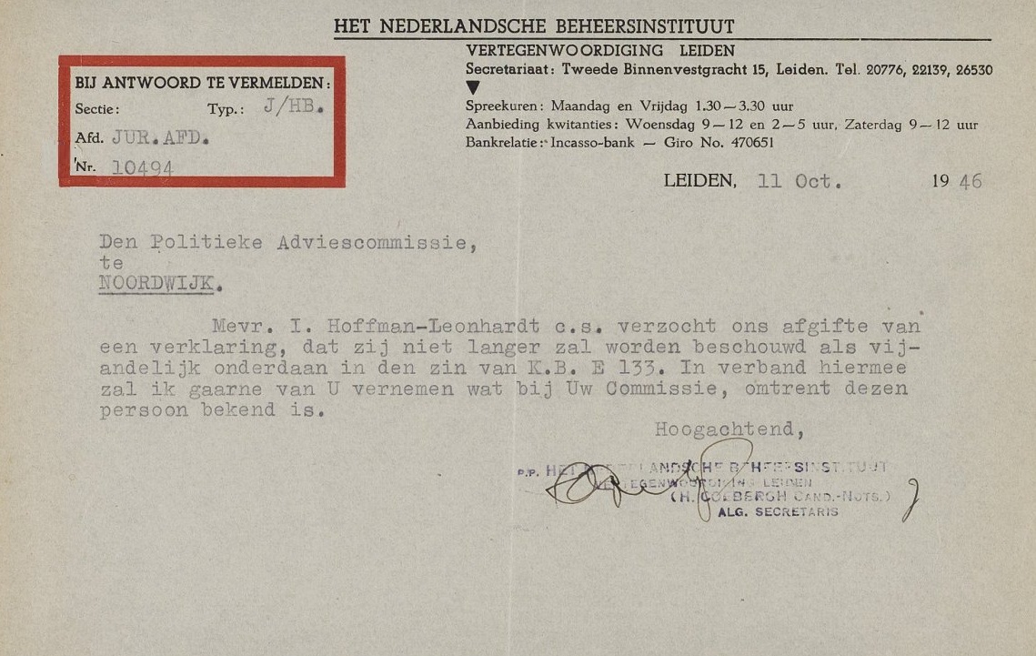 Mevrouw I. Hoffman-Leonhardt, aangetrouwde familie van de Huisterduinsche Tappenbecks, stond blijkbaar ook kort na de oorlog nog te boek als ‘vijandelijk onderdaan’, waarschijnlijk om geen andere reden dan dat ze van Duitse oorsprong was. Hoe lang zou het nog duren en hoeveel moeite moest je doen om van dat stempel af te komen? Ik hoop voor haar dat het allemaal soepeltjes gelopen is. Maar het Nederlandsche Beheersinstituut was met dit soort zaken nog tot 1967 in de weer.