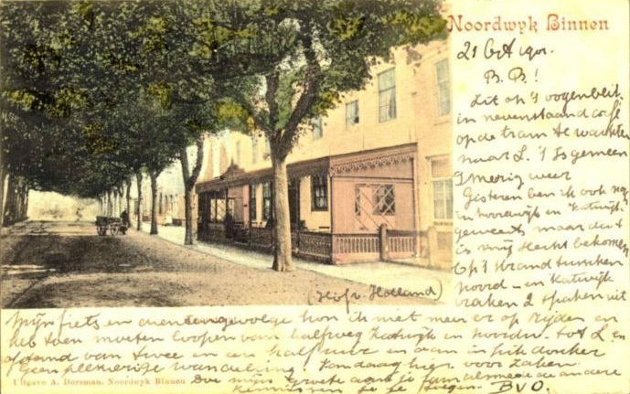 21 October 1901. B.B.! Zit op ’t oogenblik in nevenstaand café op de tram te wachten naar L. ’t Is gemeen smerig weer. Gisteren ben ik ook nog in Noordwijk en Katwijk geweest, maar dat is mij slecht bekomen. Op ’t strand tussen Noord- en Katwijk raken 2 spaken uit mijn fiets en dientengevolge kon ik niet meer erop rijden en heb toen moeten loopen van halfweg Katwijk en Noordwijk tot L., een afstand van twee en een half uur en dan in (…) donker. Geen plezierige wandeling! Vandaag hier voor zaken. Doe mijn groeten aan je fam. alsmede aan andere kennissen. Je toegen. BVO.