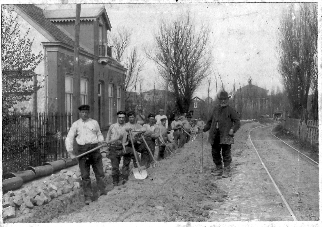 De grote man rechts, die daar als een soort van slavendrijver op de foto gaat, heette in de volksmand de Grote Turk of ook wel de IJzeren Turk. Steenvoorden was zijn familienaam, waarom hij ‘Turk’ werd genoemd, is mij niet helemaal helder. Hier is men druk in de weer met de aanleg van de riolering aan de Nieuwe Zeeweg in Noordwijk. Arbeidsintensief werk. Tegenwoordig hebbie een masjien op rupsbanden die gemakkelijker een sleuf trekt dan 12 arrebeiders bij mekaar.