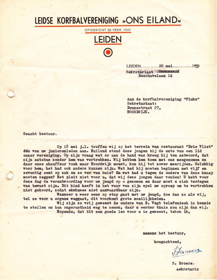 De Christelijke Korfbal Vereniging “Fluks” uit Noordwijk heeft een uitgebreide en informatie site op internet. Onderdeel daarvan – mooi historisch besef – zijn ook enkele bladzijden over de rijke geschiedenis van deze club. En daar trof ik bijgaande brief aan van de secretaris van de Leidse korfbalvereniging “Ons Eiland” aan zijn collega van Fluks in Noordwijk (volgens mij touwslager Passchier). Een nogal moralistisch, maar niet onterecht verhaal over de zorgeloosheid, waarmee Fluks haar jeugdlid B. Vegt in de kou had laten staan. Vergeten het kind mee te nemen in de bus terug naar Noordwijk.