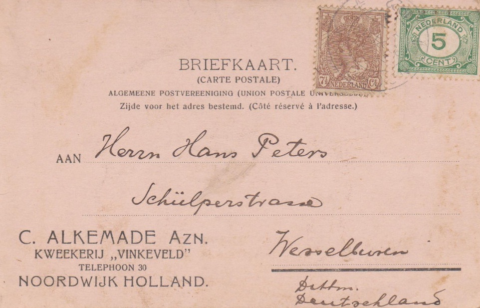 De briefkaart is van 1922 overigens. En hij ging naar ene Peters in het Duitse Weselburen, een plaatsje in Schleswig-Holstein.