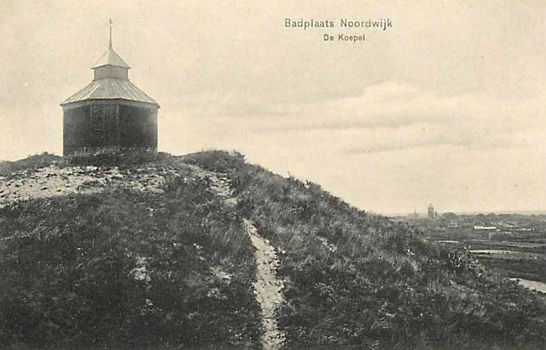 Als je de vaardigheden van een klipgeit had, kon je met veel zuchten en puffen wel aan deze koepel geraken. Hij stond hoog op het duin, meer aan de kant van de Boerhaaveweg volgens mij dan aan de kant van de Koepelweg. Maar toch. Je moet vanaf deze plek een magnifiek uitzicht op Noordwijk-Binnen en het verdere achterland hebben gehad. De mooiste plek van Noordwijk aan zee, want de mooiste blik op Noordwijk Binnen. Wat die koepel daar nu allemaal aan toevoegde, is mij een raadsel. Je kon er misschien even uitzuchten of uitpuffen op een bankie. En Ton Meijer vermeldt in zijn Straatnamenboek dat het een geliefde plek was voor de Noordwijksche jeugd op vrijersvoeten. Het ding werd gebouwd in 1897 en in 1912 afgebroken.