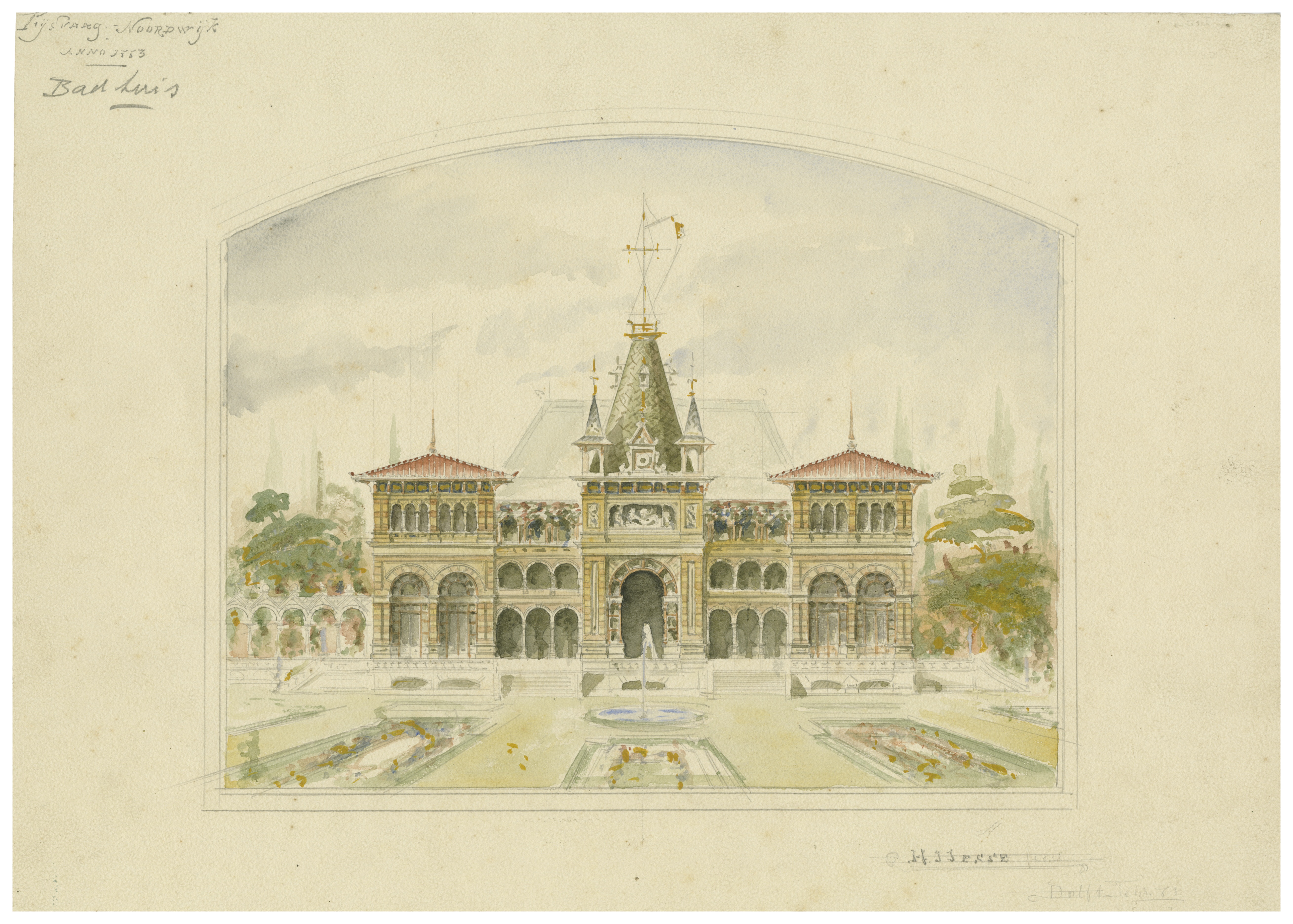 In 1883 deed de nog jonge architect H.J.Jesse (hij was nog maar drieentwintig jaar) mee met de ontwerpprijsvraag die was uitgeschreven door de Exploitatiemaatschappij Noordwijk voor een badhotel met kurhaus. Hij kon er geen prijs mee wegslepen, evenmin als H.P.Berlage, die eveneens met een prachtig ontwerp kwam aandragen. Jesse ontwierp een gebouw met Spaans-Moorse trekken, een klein Alhambra, zou ik bijna zeggen. Een beetje eclectisch en een beetje afgekeken, maar toch. En hij schilderde er een geweldig aquarel van, een beeld dat misschien nog wel veel mooier was dan het ontwerp dat nooit gebouwd zou worden.