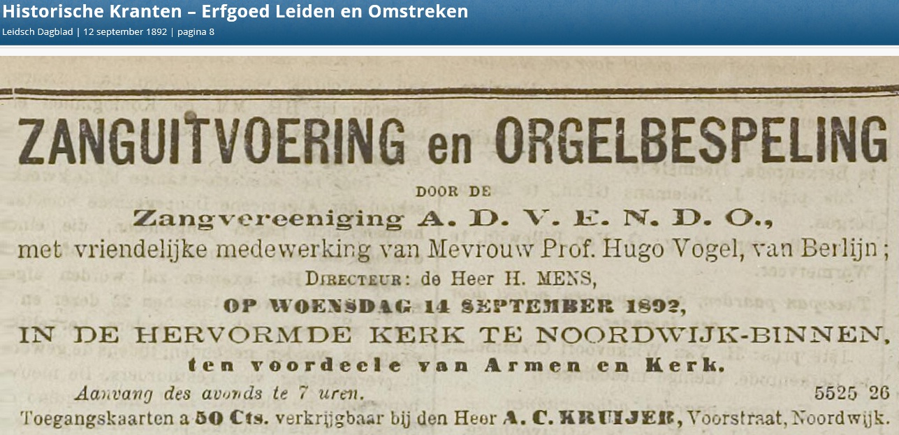 Helena werkte in ieder geval mee aan een concert op 14 september 1892 in de Grote Kerk in Noordwijk Binnen. Dat concert werd gegeven door de zangvereniging A.D.V.E.N.D.O (“Aangenaam Door Vermaak En Nuttig Door Ontspanning”) onder leiding van ene heer Mens. Wat de rol van Helena precies was, weet ik niet (Zong ze? Sloeg ze de maat? Speelde ze trombone of sloeg ze de Grote Trom?), maar feit was dat ze – hoe dan ook – in Noordwijk musiceerde.