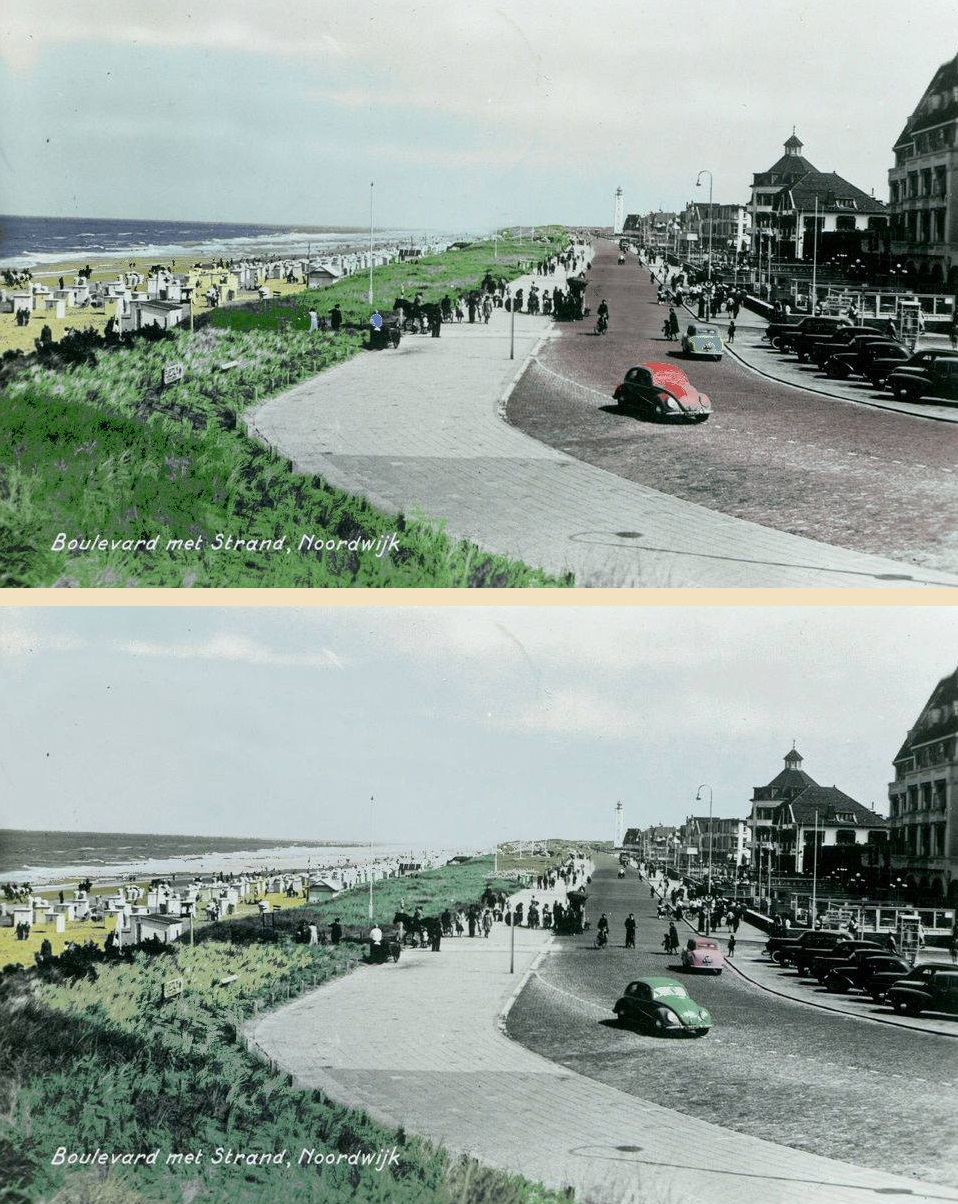 Het inkleuren van ansichtkaarten is ook een vak. Hier is een prutser aan het werk geweest, die zo te zien steeds opnieuw begonnen is, maar er – ontevreden over het resultaat – halverwege gewoon weer mee ophield (met dank aan Li-st).