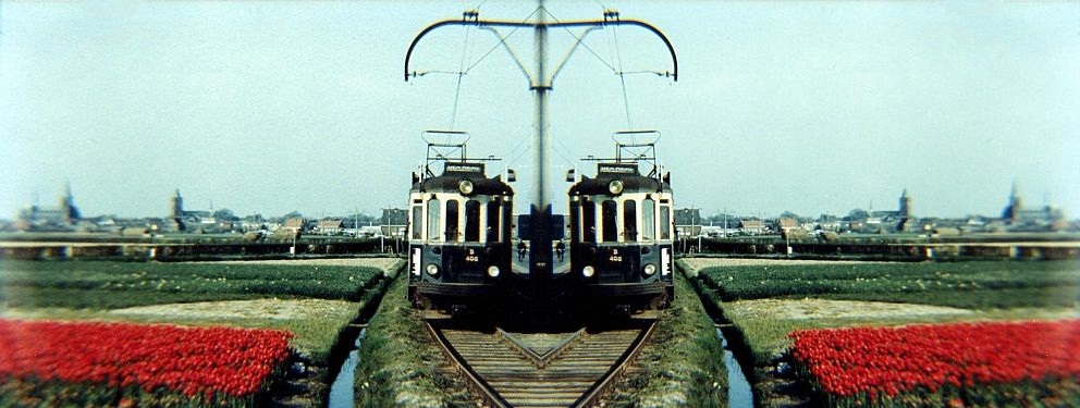 Je vraagt je af of dat wel goed zal gaan. Twee Boedapester Trams van de NZHTM op weg naar Den Haag stevenen af op eenzelfde enkelspoor. Iemand is vergeten hier een wissel te leggen en een rood sein is ook in geen tulpenvelden of wegen te bekennen. Op de achtergrond de skyline van Noordwijk Binnen. De beide torens houden hun adem in.