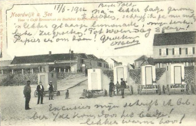 Noordwijk aan Zee, 17 juni 1902. Beste Poes (?), na ’n lekker badje genomen te hebben, schrijf ik je nu onder ’n lekker glaasje limonade, …… zeegroeten! Tot woensdag 8 dagen! Papier er om doen! Groeten……. Excuseer mijn schrift. Ik bibber van de kou voor het baden! Lekker warm hoor!