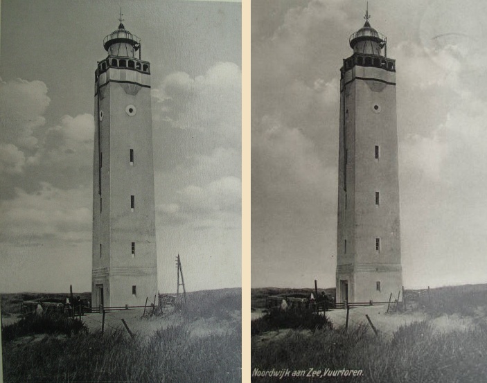 Het is dezelfde foto, maar ook hier weer van twee verschillende uitgeverijen (hoewel ik de namen van die uitgeverijen niet paraat heb). Opmerkelijk ook hier weer de verschillen: er is gemorreld aan de wolkenpartijen en de telefoonpaal die op de foto links nog fier overend staat, is op de foto rechts opeens verdwenen. Telefoonrekening niet betaald of zo (met dank aan Ronald).