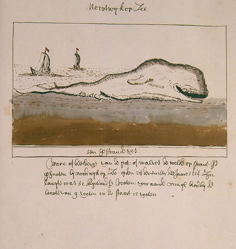 De tekening is overgenomen van een schilderij én een ets die eerder circuleerden van een aan het Noordwijkse strand gestrande walvis in 1614. Een gebeurtenis die toen veel indruk moet hebben gemaakt. Sommigen geloofden dat hiermee de duivel het grondgebied van Noordwijk betreden had en dat hel en verdoemenis de burgerij ten deel zou vallen. Het viel allemaal mee, bleek later, maar het zal allemaal niet fris geroken hebben.
