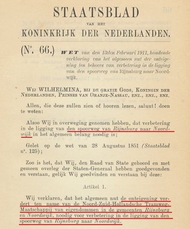 De trambaan wordt hier nog ‘spoorweg’ genoemd, maar verders was er een nog groter verschil: vroeger hadden de mensen geen inspraak in de vraag of er überhaupt een tram moest komen en of die wel langs dit of dat traject moest gaan. Vroeger namen bestuurderen daar zelf wel een besluit over en ze maakten er een heuse wet van die in het Staatsblad werd afgedrukt. En als er dan toch nog iemand sjoege maakte over het feit dat het ding dwars door zijn of haar kippenhok ging lopen, werd dat kippenhok met hoenders en al van koninkrijkswege onteigend. Zo deden we dat in 1911. Tegenwoordig kan er geen meter trambaan meer worden aangelegd tussen Noordwijk en Rijnsburg, dat heeft de geschiedenis van de Rijn-Gouwelijn inmiddels wel genoegzaam bewezen.