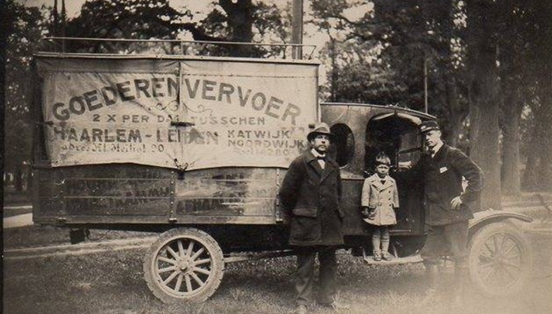 Twee keer per dag tusschen Haarlem-Leiden-Katwijk-Noordwijk. Een mooi rondje voor een transportbedrijf. Alles is mooi aan deze foto, alleen is er verder niets bekend over wie deze transporteur nou precies was. Geen – leesbare – naam op de wagen, helaas (met dank aan Ronald!)