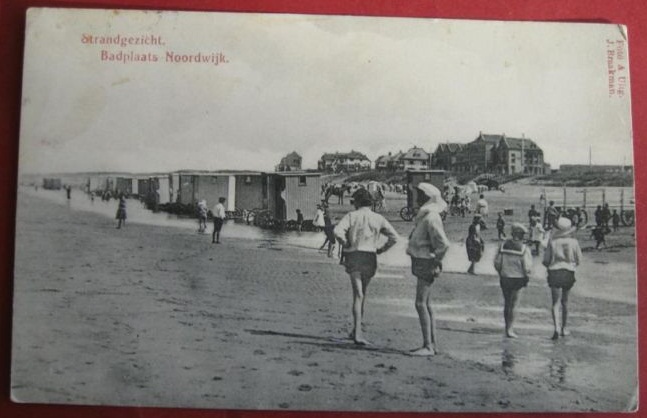 Badkoetsen voor het kimmetje, het pension en de villa’s van Hugo Hoek op de achtergrond aan de boulevard, wat kopvodden tegen de zon, een matrozenpakje en iedereen blootvoets en peinzend op het strand. Noordwijk omstreeks 1904, schat ik zo in.