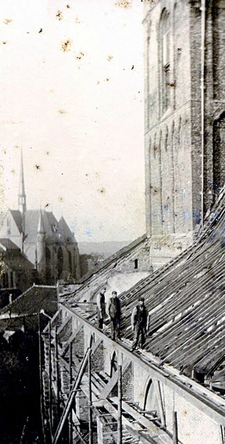 In het begin van de 20e eeuw ging alles er nog niet zo arbo-bestendig aan toe. Sterker nog: er wás helemaal geen arbo! Bouwvakkers – hier aan het werk op de Grote Kerk in Noordwijk Binnen – hadden geen relinkje of touwen, die moesten verhinderen dat ze bij de eerste de beste misstap naar beneden stortten. En de plankieren op de steigers lagen ook nog eens schots en scheef. Op de achtergrond het eerste deel van de nieuwe katholieke kerk, dat rond 1890 gereed gekomen was. De afwerking van die kerk zou volgen in 1924.