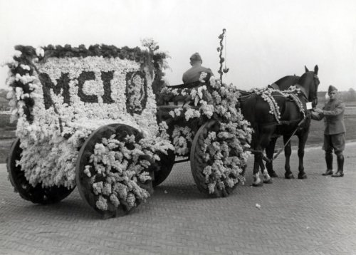 De Noordwijkse Bloemendagen van 1940 werden gehouden een paar dagen voordat de Tweede Wereldoorlog zich ook over Noordwijk zou uitspreiden. Er waren troepen gemobiliseerd, die voor de aardigheid, of uit het oogpunt van public relations of om de verveling te verdrijven ook een bijdrage leverden aan het bloemencorso, dat tijdens de Bloemendagen werd georganiseerd. Dit stelt een versierde munitiewagen voor, een nijver stukje huisvlijt. Maar – enigszins cynisch – in retrospectief kunnen we constateren dat ook met deze munitiewagen de oorlog niet gewonnen kon worden.
