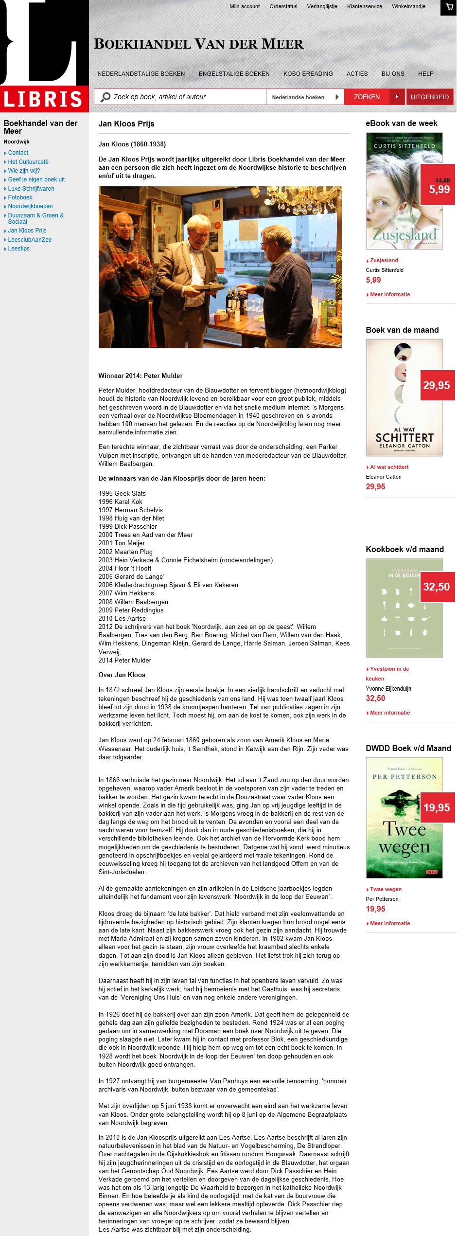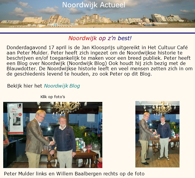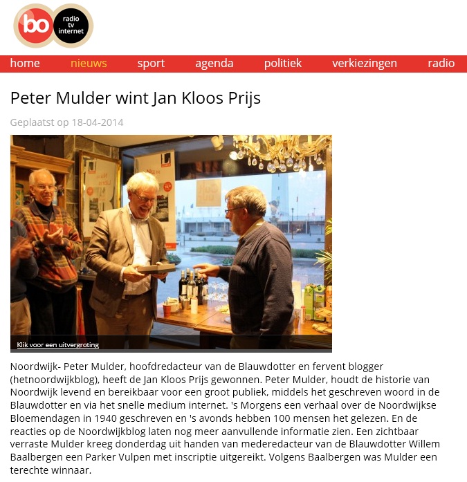 Gisteren werd de Jan Kloos Prijs 2014 uitgereikt aan ondergetekende voor BLOGnoordwijk: even onverwacht als bijzonder eervol! Dank aan de jury, de aanwezigen en de mooie woorden gisterenavond bij de prijsuitreiking en vanzelfspekend alle lezers van dit blog 🙂