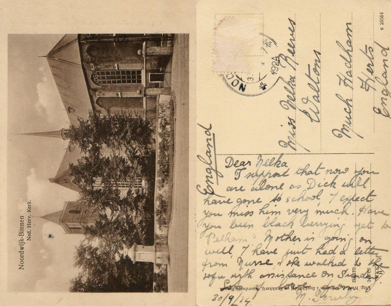 Much Hadham is een klein plaatsje in Hertfordshire/Engeland. In 1924 stuurde iemand vanuit Noordwijk daar deze kaart naar toe. Van de Oude Kerk in Noordwijk Binnen. Met achterop wat zorgen om moeders (die met enige mantelzorg lopend de sofa had bereikt) en treurnis om het gemis van een kind dat de leerplichtige leeftijd had bereikt en niet meer aldoor om moeders rokken zweefde.