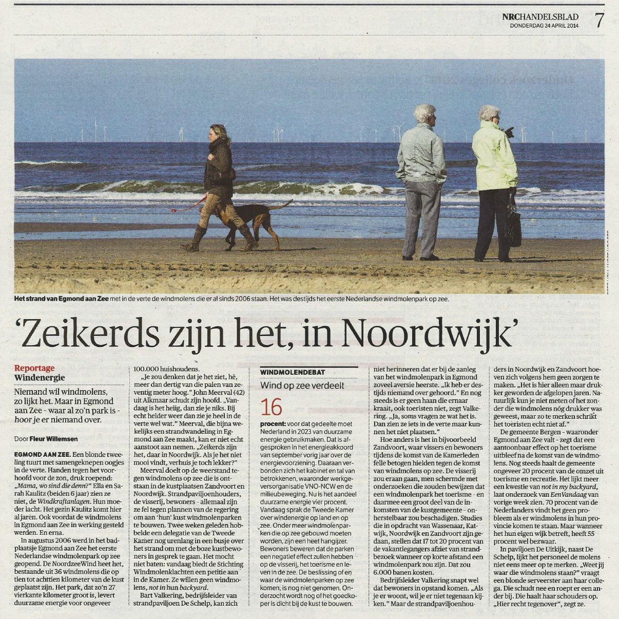 NRC-Handelsblad van gisteren was een beetje polshoogte wezen nemen in Egmond met de vraag wat men dan wel vond van die windmolens bij hunnie aan den zee-einder. Niet veel poblemen daar in Noord-Holland, was de conclusie en dat ze er in o.m. Noodwijk problemen over schopten, dat was allemaal maar onzin. ‘Zeikerds’ waren het.