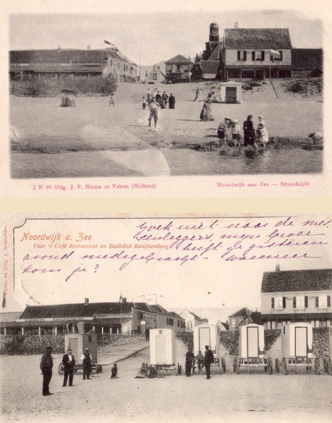 Het café-restaurant annex badhotel van Konijnenburg, op de plek van het huidige Gat van Palace, figureerde vaak op foto’s van de badplaats Noodwijk en terecht: “Knijn” was één van de pioniers van Noordwijk-Bad. Deze twee foto’s onderstrepen dat nog maar eens. Waarbij het aardig is om te zien dat de een is gemaakt door Braakman en de ander door Nauta. Die twee hebben ervoor gezogd (samen met Dorsman en later Roos), dat er veel beelden bewaard zijn gebleven van een inmiddels voorbije geschiedenis. Eerbetoon waard.