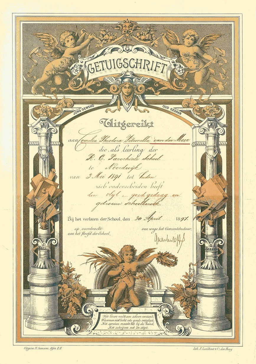 Cornelia Theodora Petronella van der Meer werd in 1884 geboren in Noordwijk. Op 30 april 1997, pardon 1897, 13 jaar oud, had ze de lagere school doorlopen en kreeg ze een ferm getuigschrift mee. Dat was een getuigschrift van de Roomsch-Catholieke Parochiale School, een voorloper van de later gesplitste Mariaschool voor meisjes en de Jeroenschool voor jongens. De parochiale school was nog gewoon gemengd, volgens mij en bevond zich toen denkelijk in gebouw Sartorius aan de Voorstraat in Noordwijk Binnen, maar dat schrijf ik uit mijn hoofd en vergt nog enige checks. Mogelijk heeft mijn grootvader nog bij Cornelia in de klas gezeten.