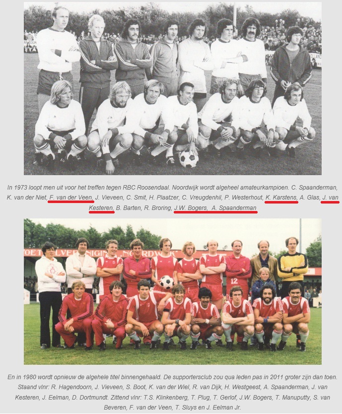 Tijd om aan betere tijden te denken en ook als hart onder de riem. Noordwijk werd tot twee keer toe algemeen landskampioen van Nederland bij de amateurs. In 1973 en in 1980, resp. 41 en 34 jaar geleden. Bij toeval kwam ik de twee elftalfoto’s tegen bij die gebeurtenissen en wat me opvalt is dat 5 spelers uit het kampioensteam van 1973 óók speelden in het landskampioenschap van 1980: Jan-Willem Bogers, Albert Spaanderman, Jaap van Kesteren, Kees Karstens en Frans van der Veen. Jan Vieveen staat ook twee keer op de foto, maar was volgens mij in 1980 al gestopt met voetballen. In mijn verbeelding was Ruud Bröring er ook beide keren bij geweest, maar op de foto van 1980 ontbreekt hij, dus dat zal dan wel niet kloppen.