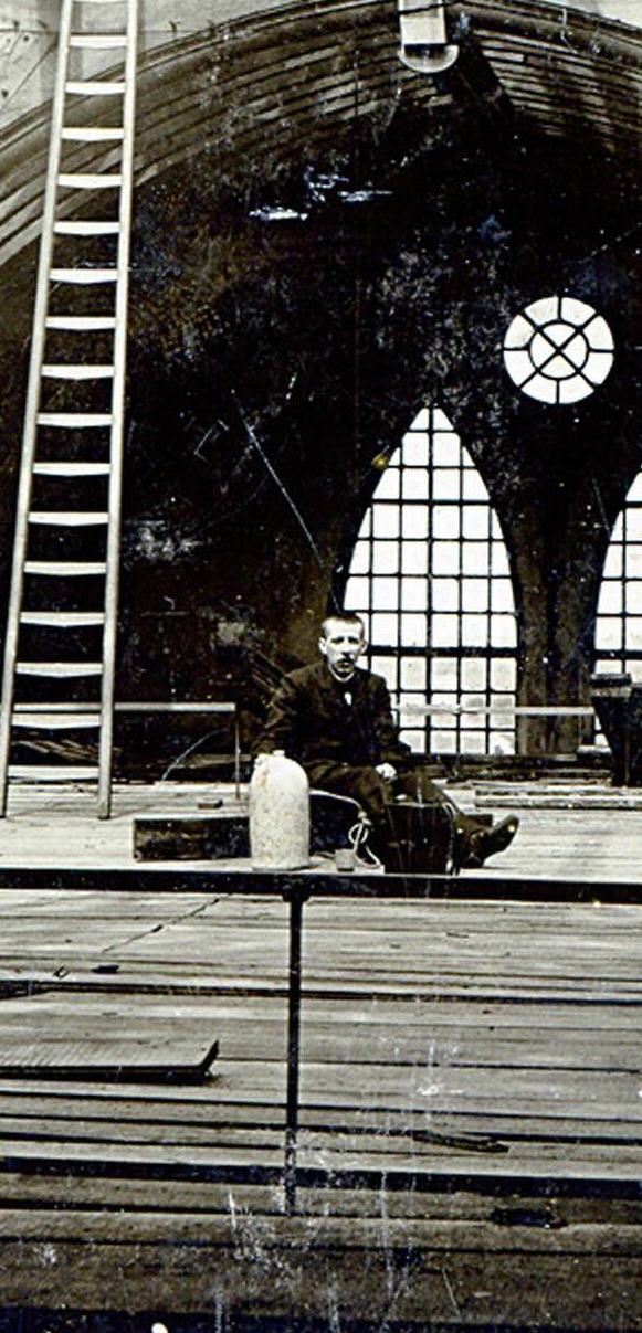 We hebben het vaak genoeg gehad over de architect Henk Jesse, die ook in Noordwijk nogal wat bouwwerken op zijn naam heeft staan. Zo ook de restauratie – in 1901 – van de oude hervormde kerk in Noordwijk-Binnen. Op de site van het Regionaal Archief Leiden duiken enkele foto’s van die restauratie op. Ook enkele foto’s zoals deze met daarop het jongere broertje van Henk, Jan Jesse. Wat Jan daar in hemelsnaam deed, weet ik niet. Mij is niet bekend dat hij aan het bureau van zijn broer verbonden was, of anderszins bouwkundig was georienteerd en op internet vind ik daarover ook niets terug. Behalve dan dat Jan in 1872 geboren was, alleen dat. Zelfs zijn sterfdatum is niet bekend, dat levert ook al een vraagteken op.