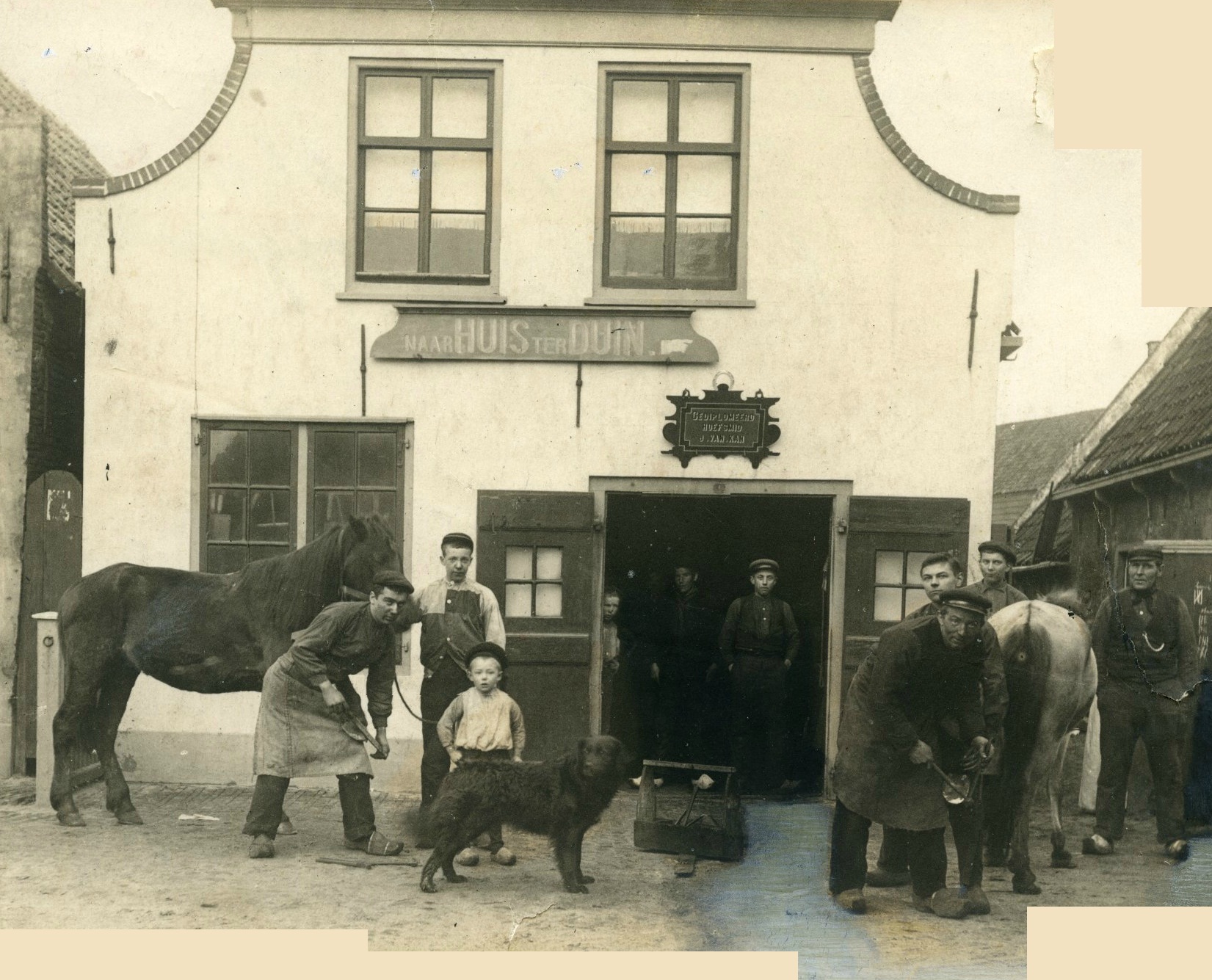 Hij was gediplomeerd hoefsmid, Jan van Kan, en dat liet-ie weten ook via een mooi bewerkt bord boven de werkplaats. Daar hing ook nog een bord dat de weg wees naar Huis ter Duin, volkomen overbodig, zou ik denken, want dat hotel stond hier zo ongeveer aan de overkant en had geen richtingwijzer meer nodig. Maar goed.