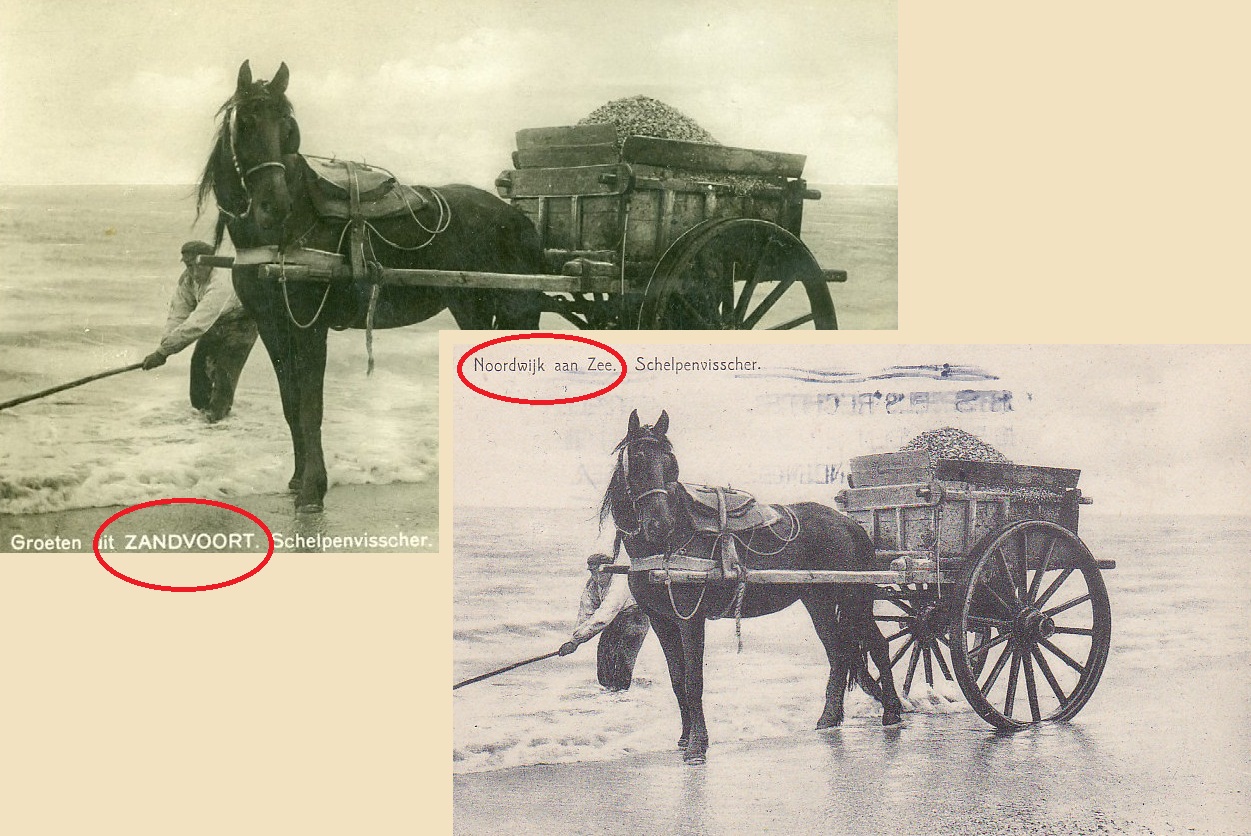 De schelpenvisser en zijn peerd moeten een end gelopen hebben, als ze zowel in Noordwijk als in Zandvoort aan de haal gingen met de schelpen. Het is wel eerder vertoond in dit blog: dat foto-ansichtkaarten met een onbestemd beeld erop, zowel in Katwijk, als Noordwijk, als Zandvoort, als Bergen, als Enzovoort werden uitgegeven. Deze visser en dit peerd hadden overal aan de kust kunnen lopen.