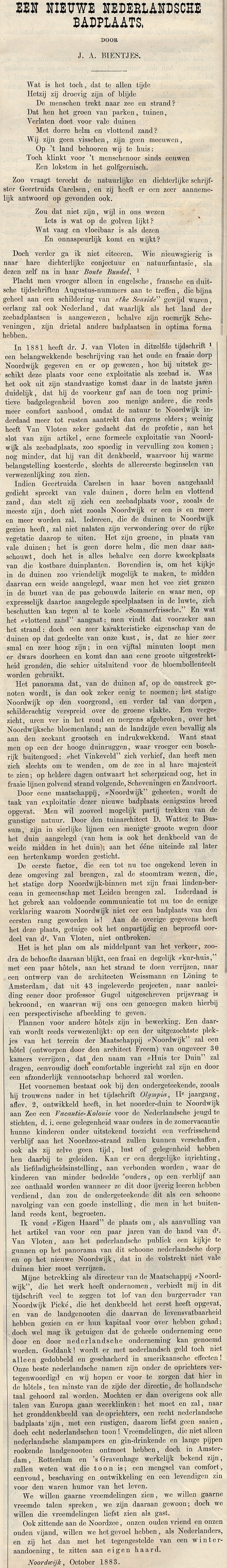 Hoi Ptjor, Ik heb op “Je bent een Noortukker” een volgende stukje uit 1819 geplaatst, gevonden in de archieven van de Leidse Courant: “De Ondergeteekende adverteert hier mede, dat hij, bezitter zijnde, van een nieuwe in Engeland vervaardigde en extra wel ingerigt BADKOETS, voornemens is, om, te beginnen met de maand Junij dezes jaars, door middel van dezelve, aan Heeren of Dames, welke dit zullen verlangen, gelegenheid te geven tot het gebruik van het KOUDE ZEEBAD; kunnende men zich tot dat einde aanmelden ten zijnen Huize te Noordwijk aan Zee, het welk tevens is ingericht om den aankomenden, voor en na het gebruik van het Bad, alle gemak te bezorgen; terwijl men zich ook aldaar van Versverschingen zal kunnen bedienen.” etc etc,