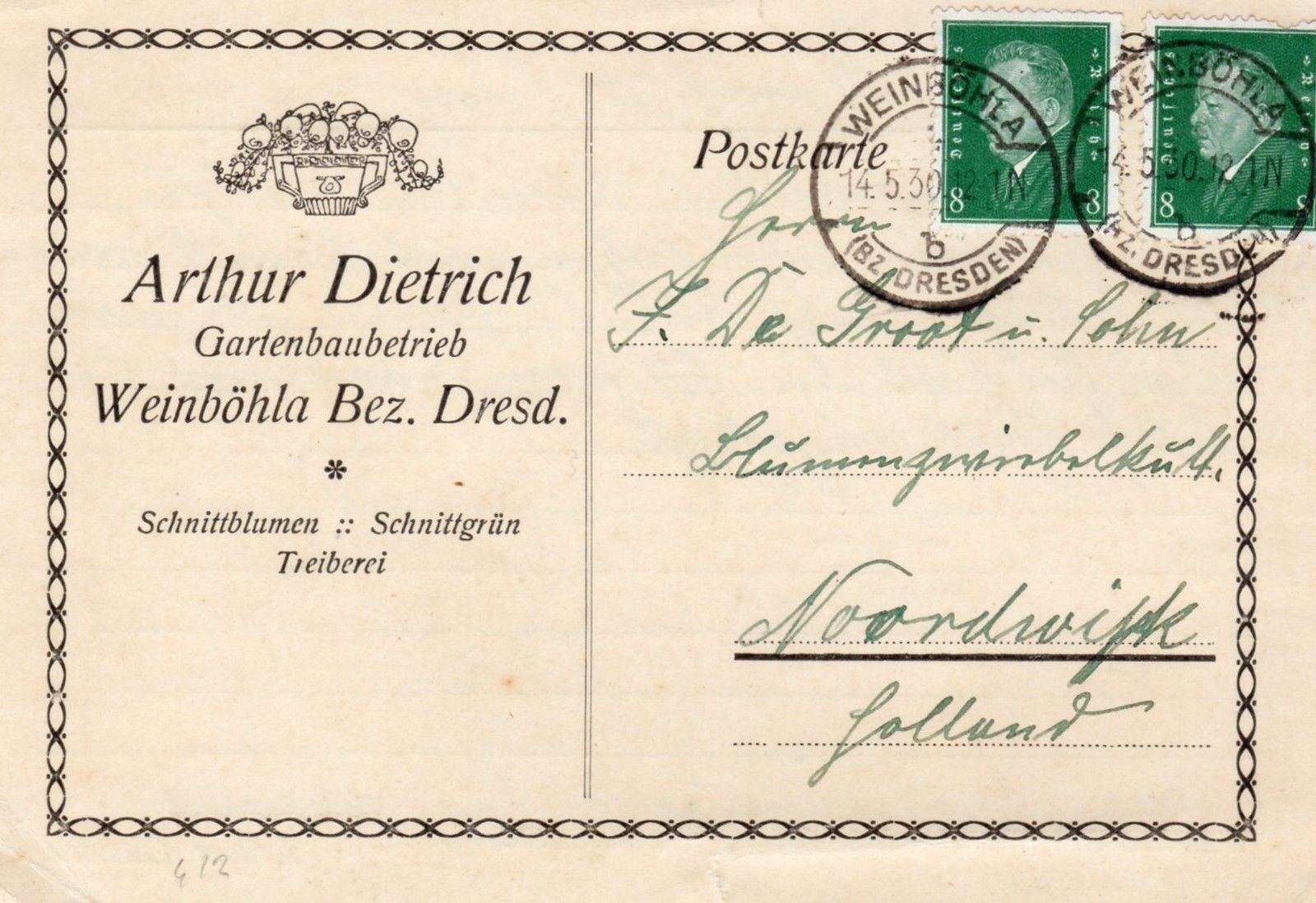 Arthur Dietrich dreef een handel in Schnittblumen en Schnittgrün. Hij deed dat in de Jaren Dertig van de vorige eeuw in Weinböhla bij Dresden. Hij stuurde een kaartje naar de firma De Groot in Noodwijk, “Blumenzwiebel-en-nog-wat”.