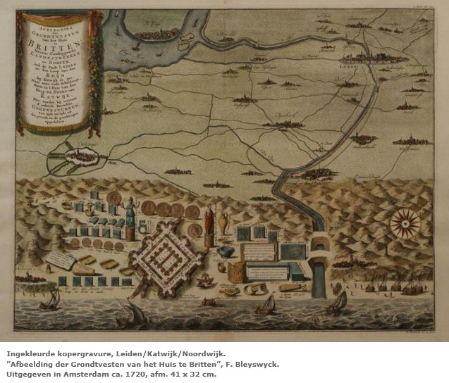 De oude Romeinse vesting “Brittenburg” zou volgens de bijschrijften bij deze ets zo ongeveer tussen Noordwijk en Katwijk hebben ingelegen, terwijl ik altijd geleerd heb dat het vestingwerk toch echt in Katwijk stond bij de monding van de Oude Rijn. terwijl er ook stemmen opgaan die zeggen dat dat hele Brittenburg nooit heeft bestaan, dat het een idée fixe is van een paar Leidenaren en Katwijkers. Een soort van verzonken Atlantis, waarnaar men ook nog steeds op zoek is.