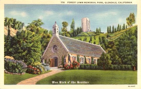 Evelyn Waugh schreef over deze begraafplaats en over alle rituelen daaromheen zijn even prachtige als satirische roman “The Loved One”. Ik heb er in september 1980 nog uit voorgelezen, staande op de preekstoel van de Wee Kirk O’ the Heather (foto onder), een kerkje op dit terrein, dat ook in “The Loved One” een rol speelt.