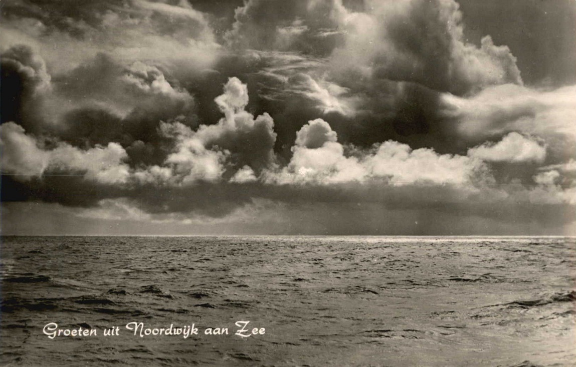 “Groeten uit Noordwijk aan Zee”, maar het zijn wel erg onheilspellende groeten. Donderende wolken boven de Noordzee, hel en verdoemenis in aantocht, het ziet er allemaal uit als de Dag van het Laatste Oordeel. Als je zulke groeten vanuit Noordwijk aan Zee kreeg thuisgestuurd, bedacht je je nog wel even. Je zou nooit meer verder gaan dan Noordwijk-Binnen.