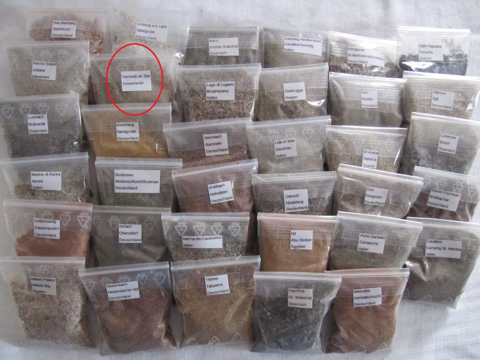 In Duitsland zit iemand zakkies zand te verkopen: 35 Sorten Sand aus aller Welt! Ook uit Noordwijk aan Zee. Voor een prikkie: € 9 per stuk (+ € 4 verzendkosten). Om jezelf zand in de ogen te strooien.