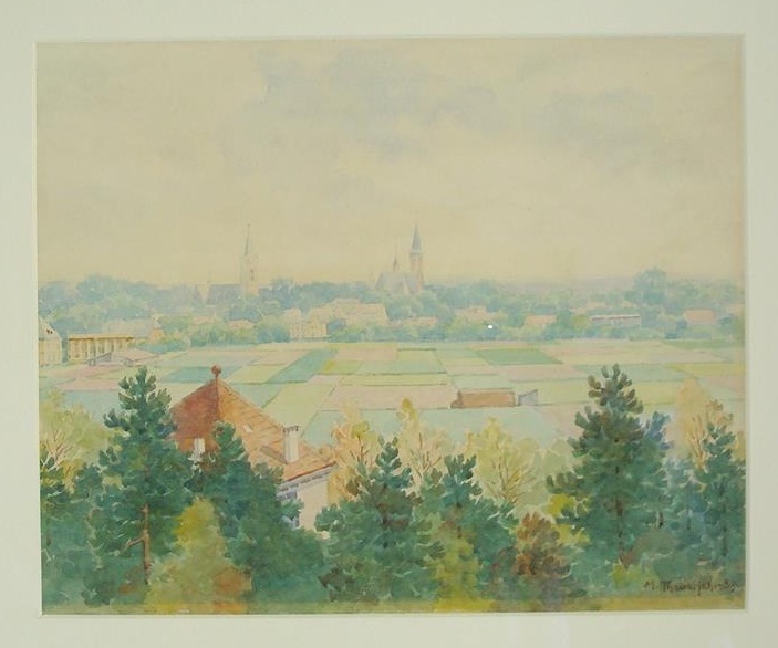 Martin Theuerjahr (1869-1949) kreeg in Berlijn zijn opleiding tot leraar, maar alras ontwikkelde hij een aanvullende specialisme: dat van tekenleraar. Die functie bekleedde hij voor het eerst aan de “Herzogliche Vorschule” in het stadje Köthen, ergens boven Halle in de voormalige DDR. Hij staat niet te boek als een groot schilder – hoewel zijn naamsbekendheid in Duitsland redelijk verspreid is. Eerder wordt hij een “Heimat-schilder” genoemd, iemand die genoeg inspiratie vindt in zijn directe ‘Heimat’, in dit geval het stadje Köthen. Maar hij was ook in Noordwijk, in 1939 en maakte daar dit prachtige aquarel vanaf de Prins Hendrikweg kijkend naar Noordwijk-Binnen.