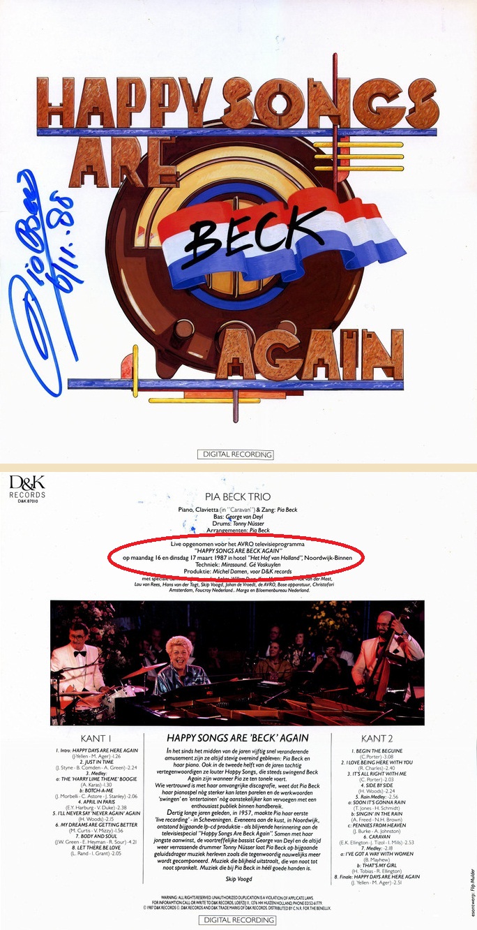 Pia Beck was een befaamd jazzpianiste en deels ook ‘Noordwijkse’ (ze woonde in haar laatste jaren in Noordwijk aan Zee). Ze had haar eigen trio en daar trad ze vaak mee op op radio en tv. Het trio bestond naast haarzelf uit George van Deyl op bas en Tonny Nüsser op drums. Op 16 en 17 maart 1987 gaf ze concerten in “Het Hof van Holland” aan de Voorstraat in Noordwijk-Binnen. Van die optredens werden tv-opnamen gemaakt, die op 5 mei 1987 door de AVRO werden uitgezonden op Nederland 1.