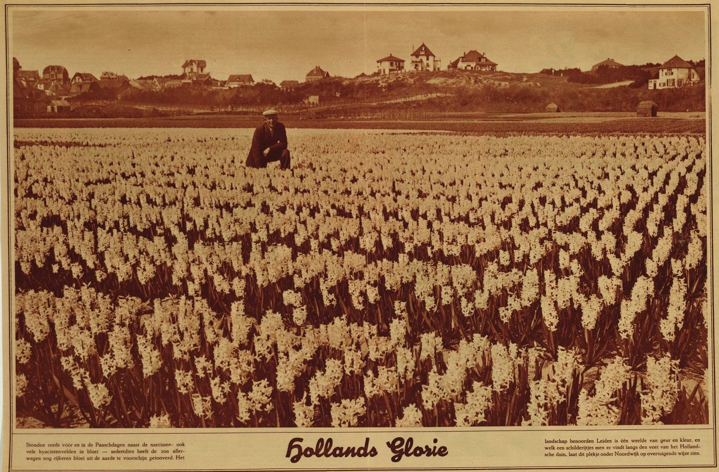 Het is natuurlijk ook wel een héél mooi plaatje: bloembollenvelden in volle bloei en daarachter de hoogoprijzende duinen bij Noordwijk aan Zee: Vinkenveld met op de achtergrond villa’s aan de Koepelweg. “Hollands Glorie”, inderdaad, daar valt helemaal drie keer niks meer op af te dingen. Foto uit een tijdschrift (onbekend welk). Voorjaar 1930.