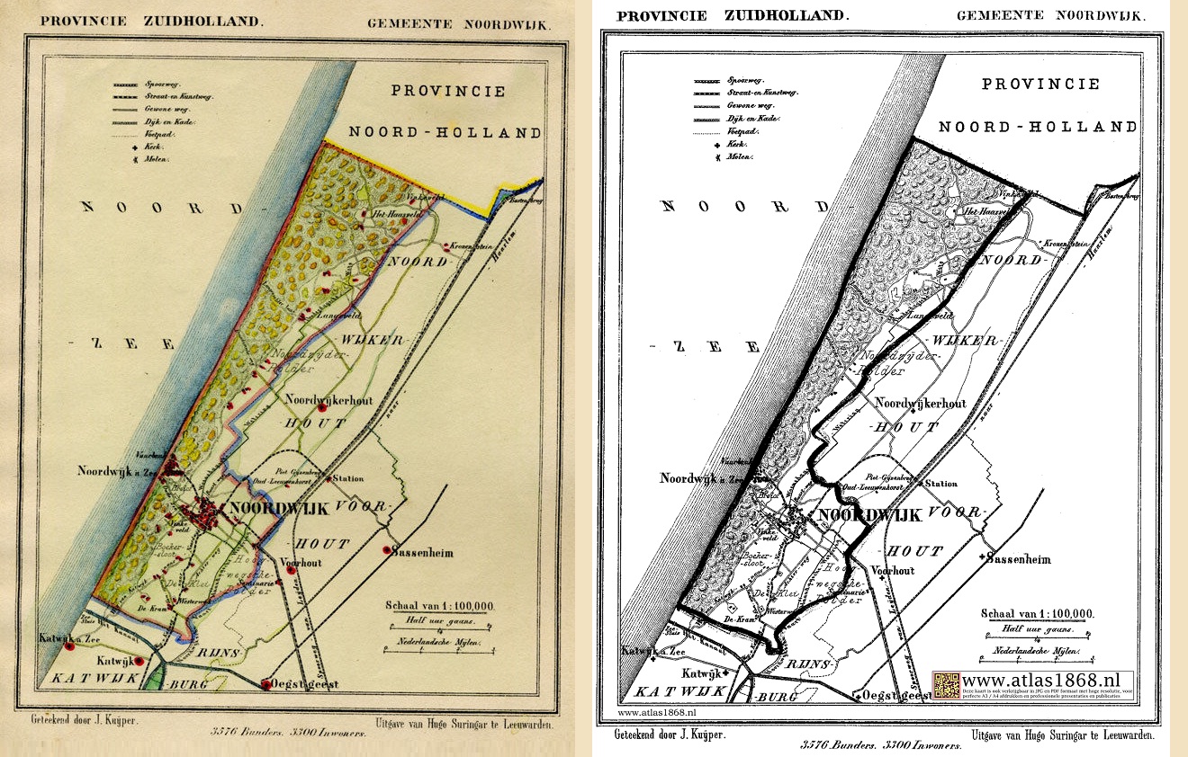 De kaart is gemaakt in 1865 door Jacob Kuyper (1821-1908) en hij komt uit diens monumentale “Gemeente Atlas van Nederland, naar officiële bronnen bewerkt.” Blijkens de kaart telde Noordwijk ongeveer evenveel inwoners als er bunders gingen in zijn geografisch oppervlak. De gekleurde versie van de kaart staat al jaren te koop op ebay voor zo’n 160 euro.