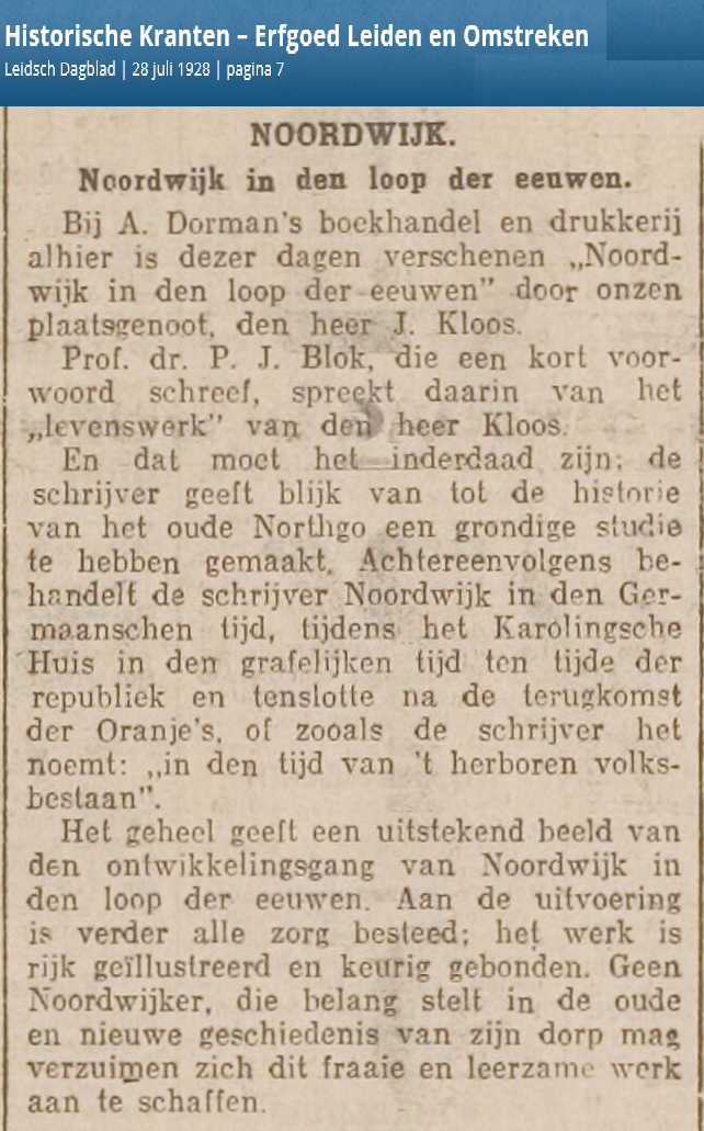 Een nagelaten bericht bij de verschijning in juli 1928 van het boek “Noordwijk in de Loop der Eeuwen” van Jan Kloos. In een blog dat dit jaar werd geëerd met de Jan Kloosprijs, mag dit bericht bepaaldelijk niet ontbreken. Genoemde professor Blok – historicus – was overigens ook een Noordwijker, zij het niet van geboorte. Hij woonde aan de Noordboulevard in een prachtig pand, dat later zou uitgroeien tot hotel-restaurant De Zeeleeuw. En hij schreef ook nog eens een verhaal over de Heilige Jeroen en diens – onterechte? – heiligverklaring.