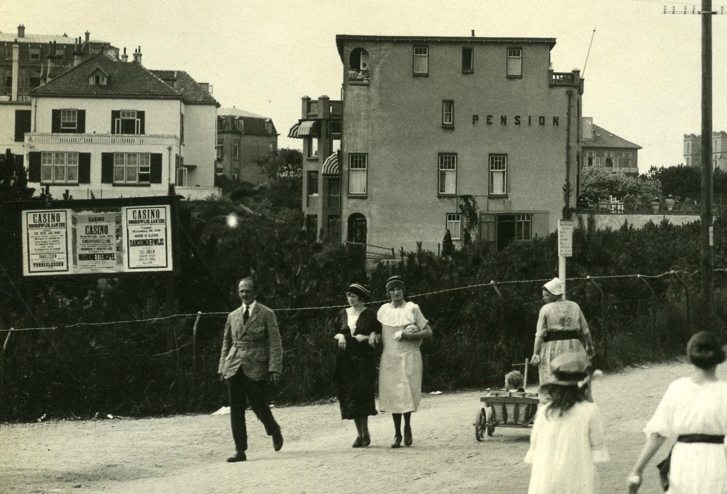 De zijkant van Pension Verloop en links de VillaHaufe. Op de achtergrond de diverse onderdelen van het Huis ter Duincomplex. Men flaneert, een vrouw trekt een bolderkar-met-kind naar het strand. Links bij de toegang van het Casino-terrein affiches, waarop reclame wordt gemaakt voor tennislessen én danslessen. Misschien dacht men bij Casino dat tennissen en dansen wel behoorden tot dezelfde tak van sport. De foto is van 1925. Feit is dat je daar tot ver in de Jaren Zeventig en Tachtig nog steeds kon tennissen én dansen. Ik heb er nooit getennist. Wel gedanst. Op de muziek van de vroege Golden Earring.