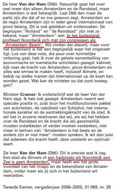 Ik had er nog nooit van gehoord, maar blijkbaar is de term “Amsterdam Beach” een marketing term, een ‘branding’ van Noordwijk. Het zal wel en vermoedelijk werkt het ook nog. De korste afstand tussen het Vuurtorenplein in Noordwijk en de Dam in Amsterdam is 45,8 kilometer. Dat is voor de gemiddelde buitenlander geen onoverbrugbare afstand en de combinatie van Amsterdam en ‘beach’ is een aantrekkelijke. Maar een zekere mate van absurditeit zit er natuurlijk wel in, zoals ook het Kamerlid Boris van der Ham al 5 jaar geleden in de Handelingen van de Tweede Kamer liet optekenen.