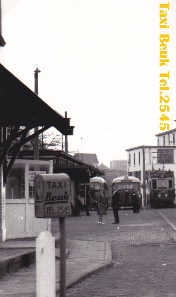 Ik kan wel foto’s van “Je bent een Noortukker” blijven plukken (de tramfoto’s van Dick zijn formidabel mooi), maar daarvoor moet je maar naar die site zelf. Nog ééntje dan, uitvergroot naar een specifiek object dat op de (grotere) foto voorkomt: Een telefoon, waarmee je (2545) een taxi van de firma Beuk kon oproepen. Tegenwoordig heb je daar een speciale app voor op je Iphone, maar vroeger deed je dat dus met een bakelieten apparaat, dat in een doosje zat op een paal bij het tramstation in Noordwijk aan Zee.
