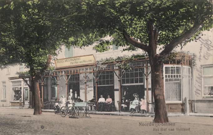 Ik heb het hier al vaker verteld. Vaak zijn de amechtige pogingen van ansichtkaartenuitgevers om tenminste een beetje kleur op hun produkten aan te brengen tot mislukken gedoemd. Of ze maken het niet af en kleuren alleen maar een paar hoofdobjecten in. Maar zelfs in zulke, half verstoken pogingen krijgen de foto’s toch nog een speciale sfeer. Zoals deze van het aloude Hof van Holland aan de Voorstraat in Noordwijk Binnen.