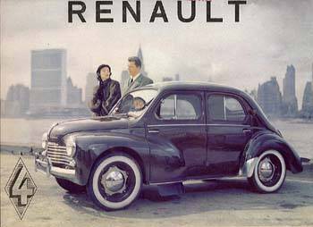 het is een Renault 4cv van de eerste generatie (1948 tot ongeveer 1953), hier in de wandeling Quatre genaamd. Hij was bepaald veel kleiner dan de Peugeot 203, maar de vormgeving was evengoed afgekeken van de Amerikanen.
