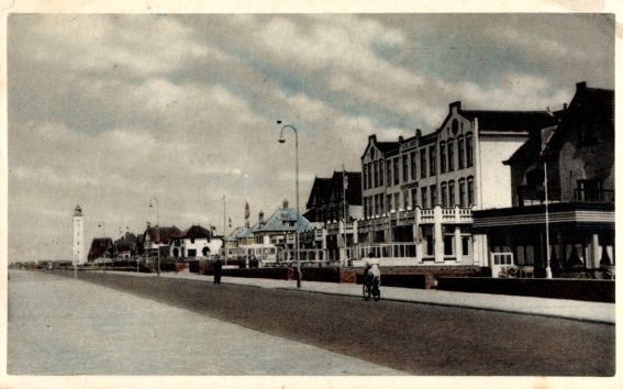 Iemand heeft bij het inkleuren van deze kaart een aanloopje genomen, maar was het gauw zat. Beetje blauw in de lucht, beetje blauwgrijs voor anderhalf pannendak en een beetje bruin-beige op de terrasmuren. Dat was het zo ongeveer wel. De rest was ook veuls te donker om er nog een beetje kleur in te krijgen.